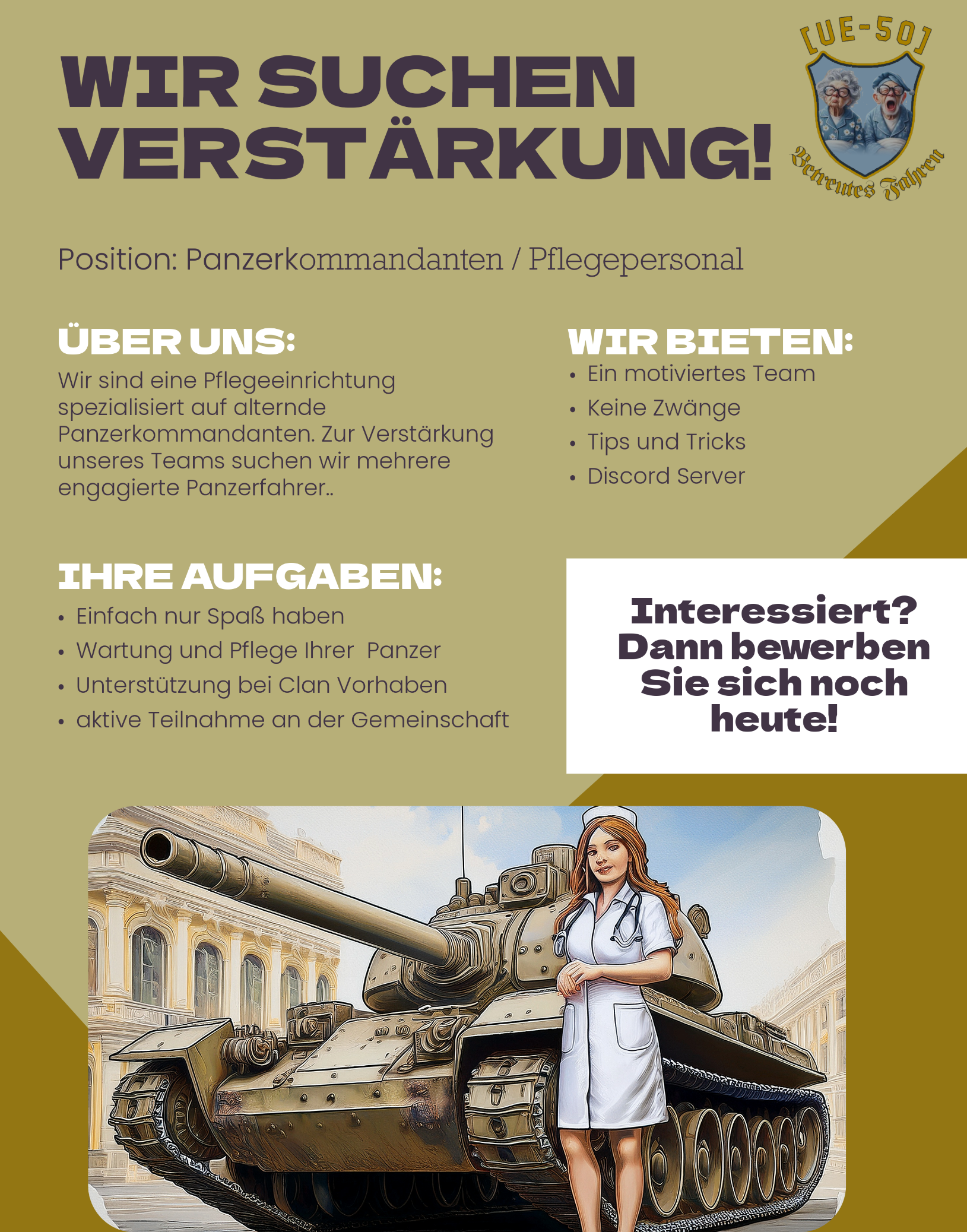 Wir sind eine WOT-Spielergemeinschaft, die einfach nur gemeinsam Spaß haben möchte. Wir wollen nicht als einsame Wölfe in der WOT-Welt umherfahren, sondern suchen immer neue Kameraden, um in Zügen fahren zu können.